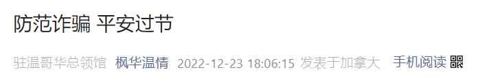 中国驻温哥华总领馆官方公众号“枫华温情”12月23日发布文章《防范诈骗 平安过节》,提醒领区中国同胞及留学生防范各种诈骗,平安过节。