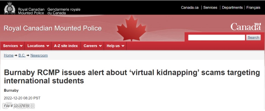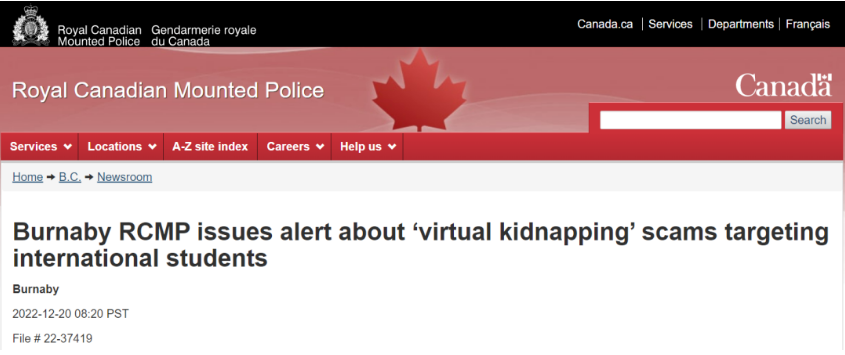 12月20日,在最近发生的一起针对居住在本拿比的国际学生的虚拟绑架事件后,本拿比皇家骑警发布了关于虚拟绑架诈骗的公众警告。
