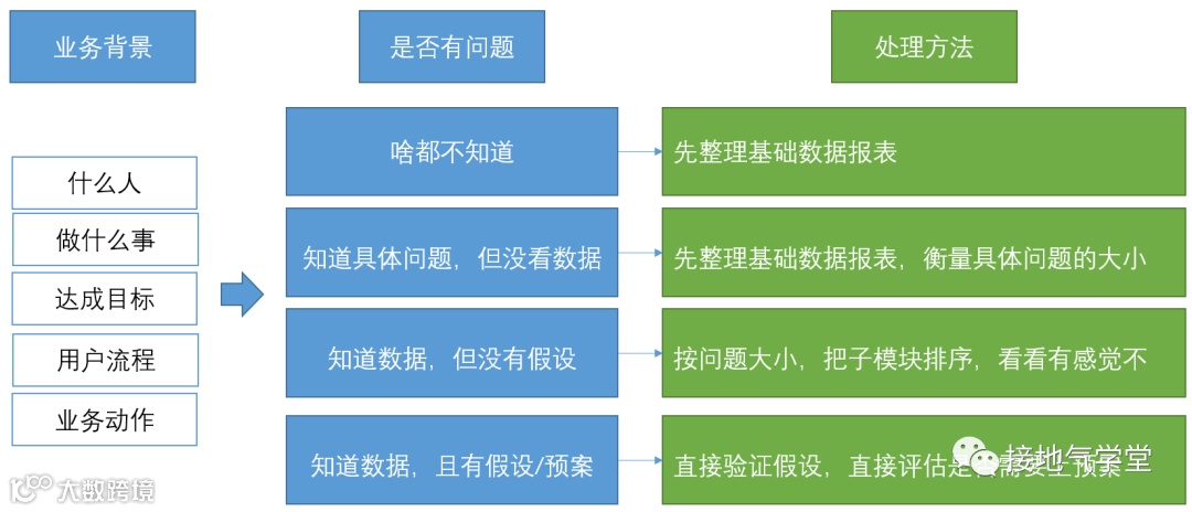 解决方案和上个问题同样,先理解业务场景,找到真正的问题,再组织方法。而不是先拿个套子,见啥都套一下。数据分析是为业务服务的,业务到底对问题了解多少,是分析的起点(如下图)。