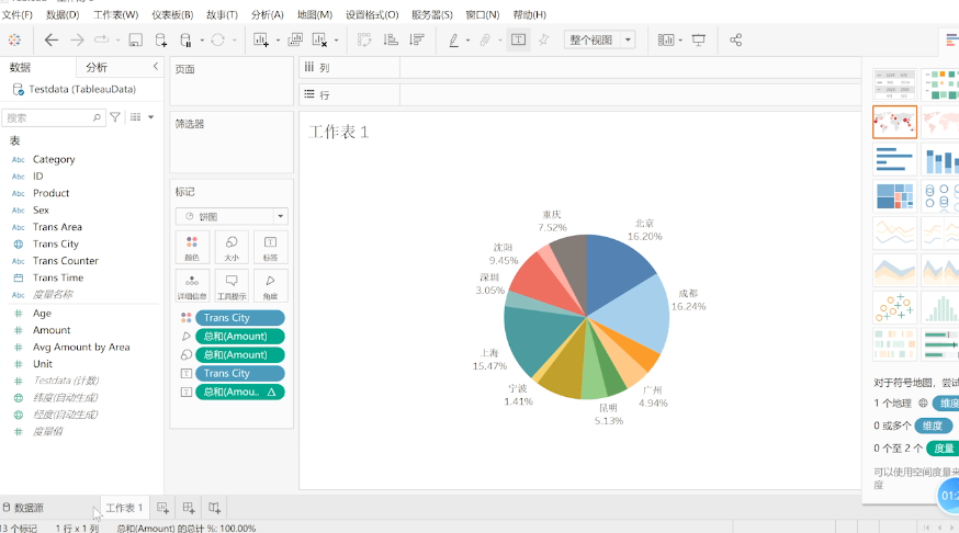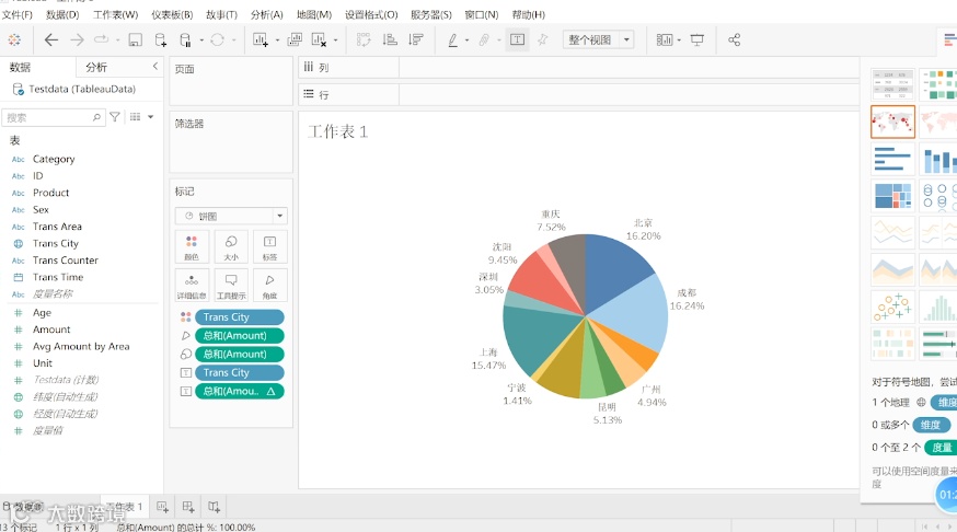 所以我们需要将实际销售额进行转化,在Amount这里进行快速表计算,然后计算出来每个城市的实际销售额的占比情况。
