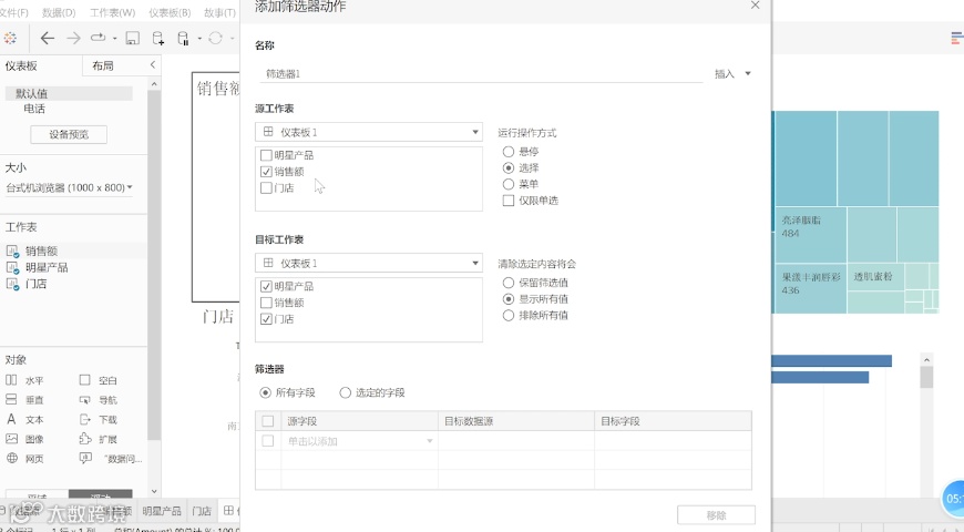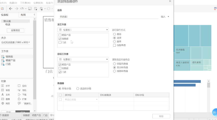 选中饼图,选中实际城市的销售额情况,接着选择工作表,选择操作,然后添加动作,添加筛选器,之后选到仪表版的这张表。