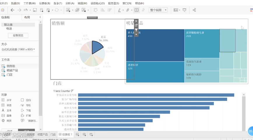 接下来希望销售额的这张表,通过选择不同的城市,然后能够联动明星产品以及门店的情况,通过选择具体的某个城市,然后去联动这个城市的销售额情况。