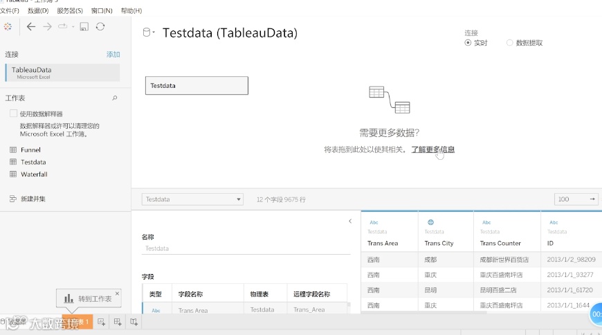 连接进来数据之后,将所需要用到的表拖拽到工作簿当中。然后这边就提示了转到工作表,然后新建一张工作表。