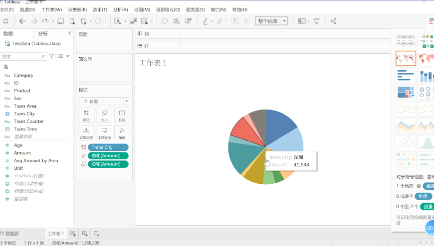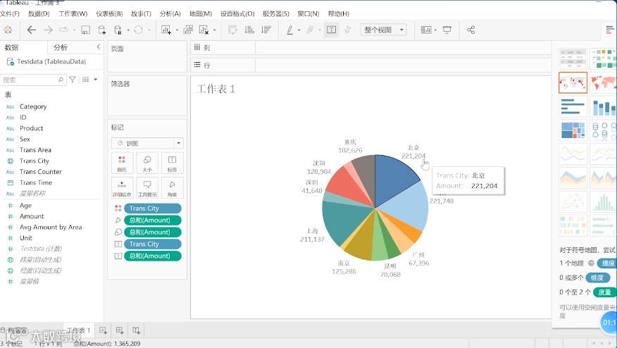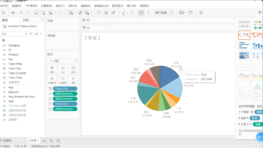 让我们先将销售额拖拽到工作表当中,然后将不同的城市拖拽进来,拖拽到大小,然后将图形转换成饼图,这就初具雏形了。