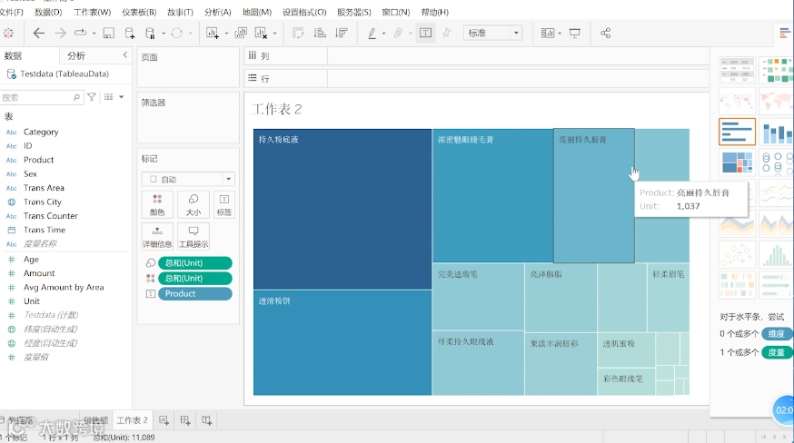 然后因为是不同的产品,将产品拖拽到大小,然后选择树状图,这样就得出来了不同产品不同售卖数量的分布情况。