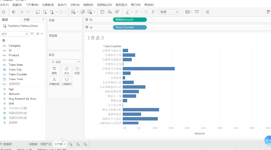 我们将门店拖拽到行当中,将销售额拖拽到列,条形图就自动出来。这样我们初步已经将三张图表都做好了,将第三张也命名为实际的门店情况。