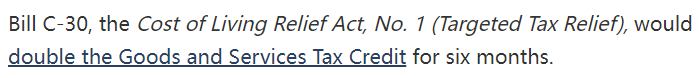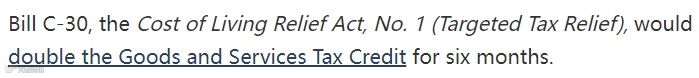第一项是C-30法案,即生活成本减免法案,这个法案将在6个月内使得商品和服务税收抵免增加一倍。