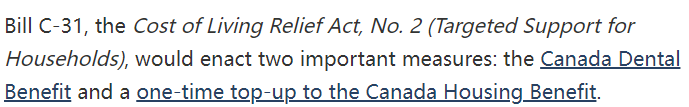 第二项则是C-31号法案,生活费用救济法案,主要是针对家庭的支持,涉及了两项重要措施:加拿大牙科福利和加拿大住房福利的一次性发放。