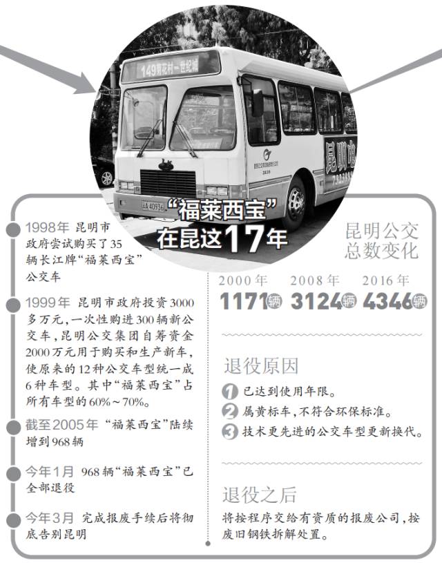 从1998年至2005年,昆明陆续将“福莱西宝”的数量增到968辆。从1998年到今年1月,“福莱西宝”一直在昆明城市街头奔跑着,只不过后来随着客车技术的提升和公交服务品质的提高,低踏板、有空调等高配置公交车逐渐取代了“福莱西宝”等老旧车型。“福莱西宝”的使用逐渐边缘化,后来更多在偏远线路使用。