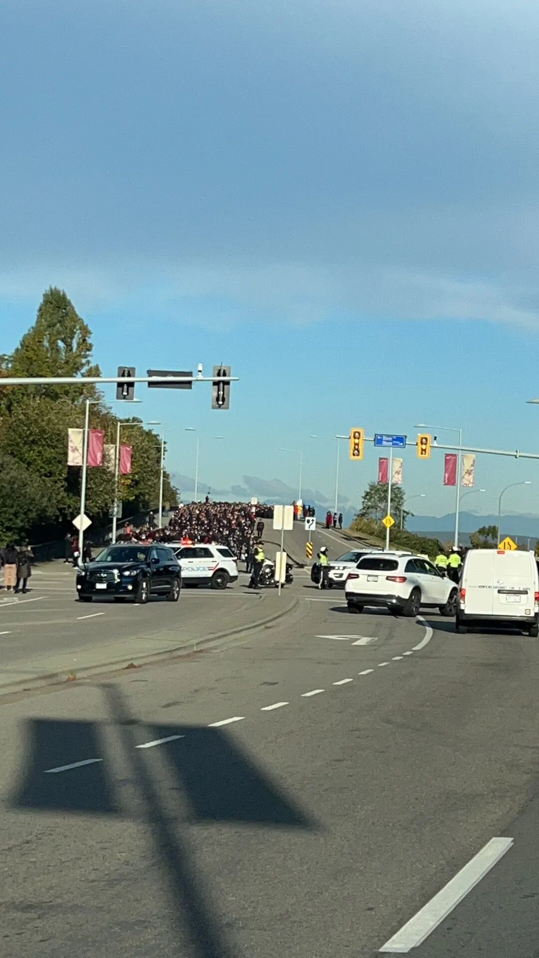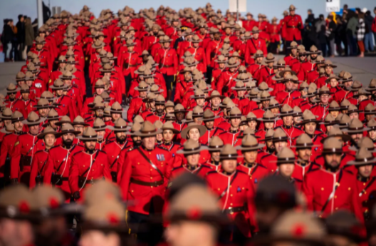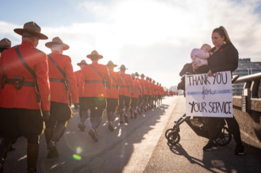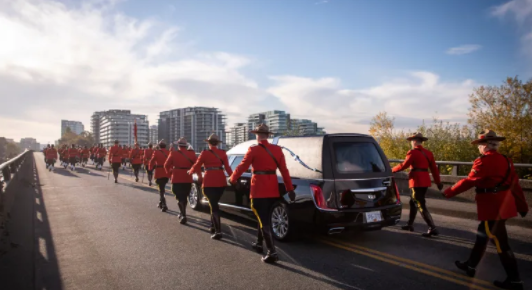今天,数千名身着红色警服的皇家骑警齐声游行,为亚裔警员 Shaelyn Yang 举行葬礼。