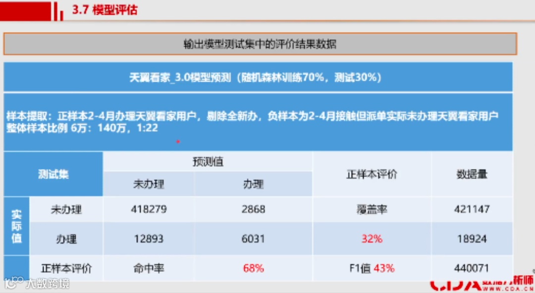 模型评估会输出混淆矩阵,行是实际值,实际有没有办理,列可能是预测值,预测它有没有办理。营销比较关注的是命中率,也就是说预测差不多有8000多个人会办理这个产品,但实际上办理了多少,这里实际办理有6000多,所以命中率是68%。预测得准不准非常重要。