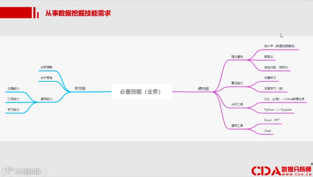不同于算法工程师对算法的要求会比较高,像偏业务的数据挖掘的岗位,对算法的要求没那么高。你能够做到理解算法的基本原理跟应用场景,能够应用工具去实现它,能够解读算法最后的结果,也就差不多了,对数学的要求也并不太高。