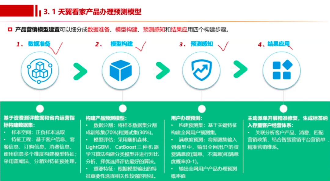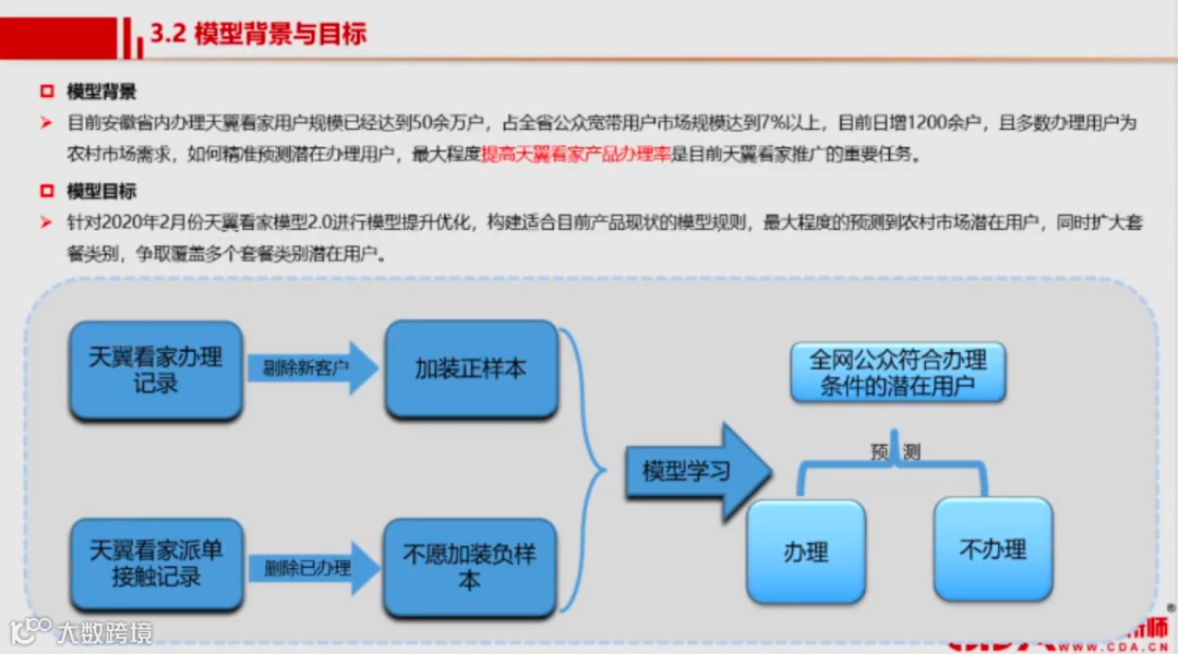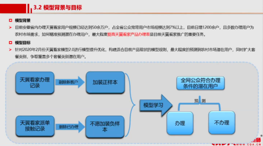 下面分步骤讲一下模型的情况。首先是模型的背景,目前已办理天翼看家用户的规模,建置模型的预期等目标。