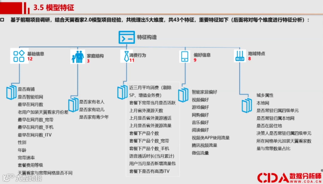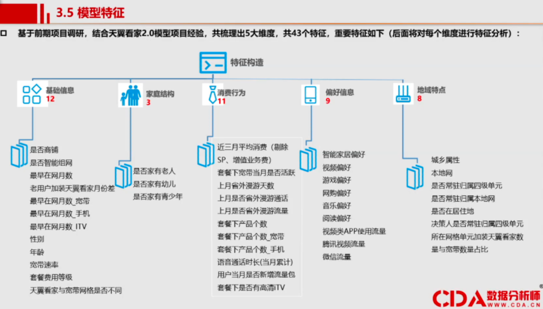 特征工程也就是特征构造,基于客户的一些基本属性信息,还有套餐信息,包括产品订购的信息,包括消费信息。其实还有很多其他维度的信息,比如说浏览内容、访问轨迹、位置信息等都可以考虑进来。
