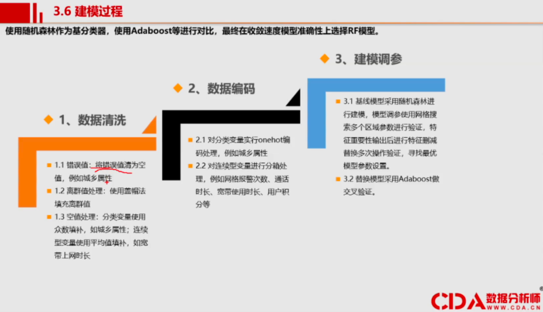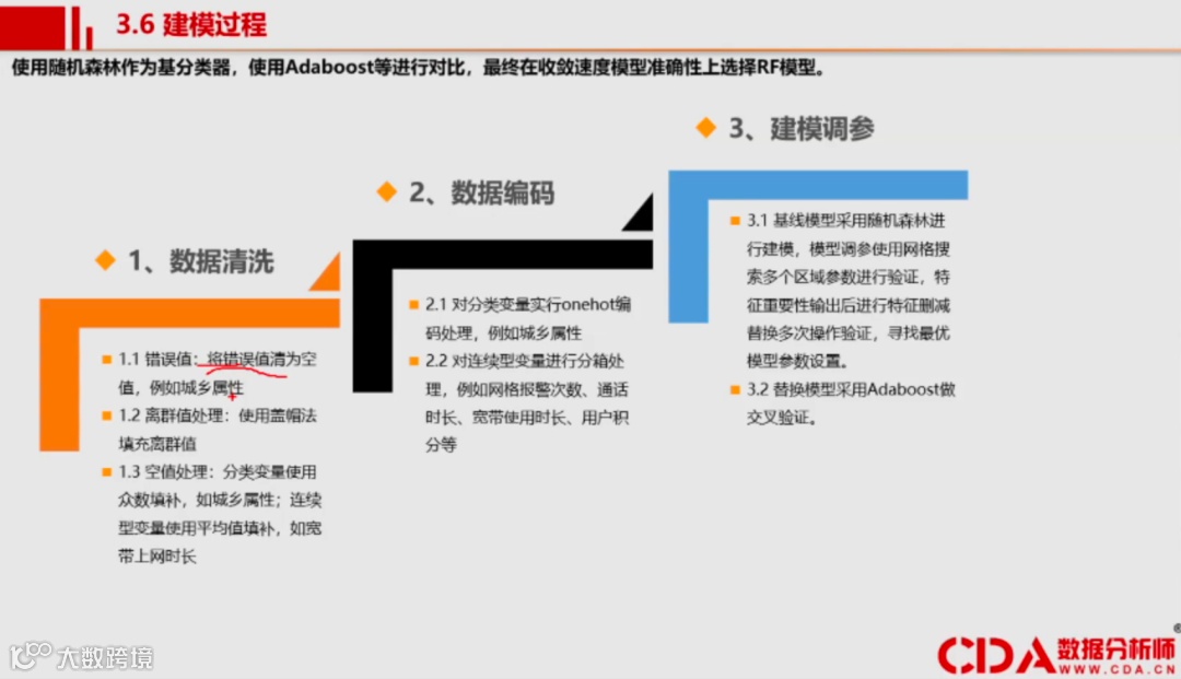 建模过程方面,也是一些常规的流程。比如数据清洗中,错误值的填充,错误值的处理。离群值可以使用盖帽法进行处理,对于套餐价值量可以进行离群值的处理。然后空值的填补,比如说像分类变量连续性变量,可以用一些统计方法或模型方法来做。