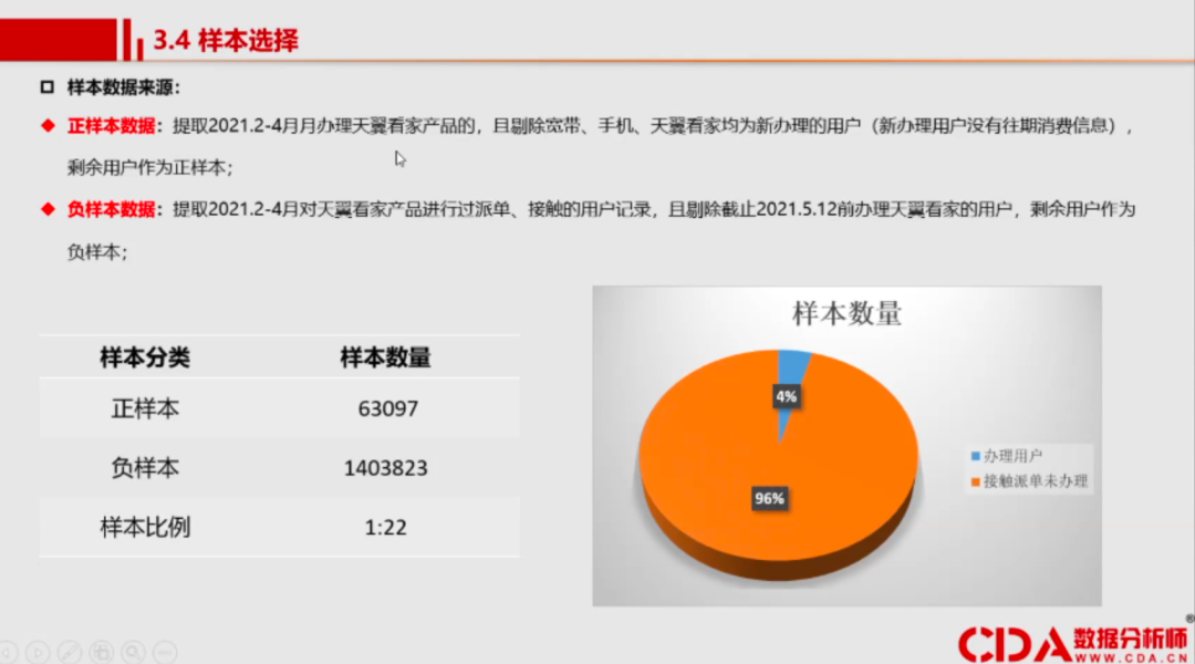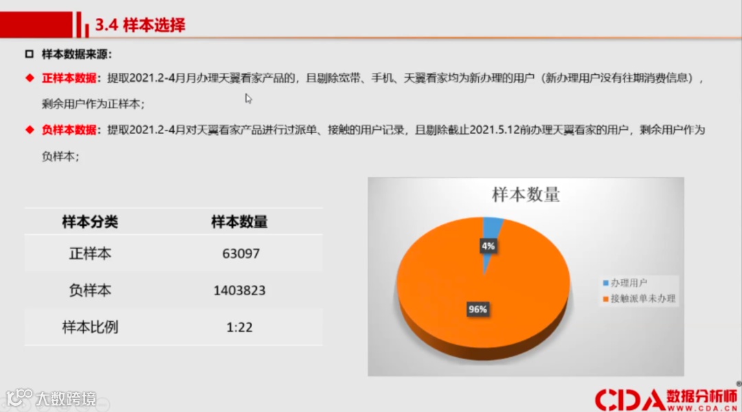 样本空间包括特征空间,样本空间就是正负样本。正样本就是已经办理,比如说11月已经办理的用户作为正样本,同时这个月没有办理的用户都可以作为负样本。接着进行抽样,构造样本空间。