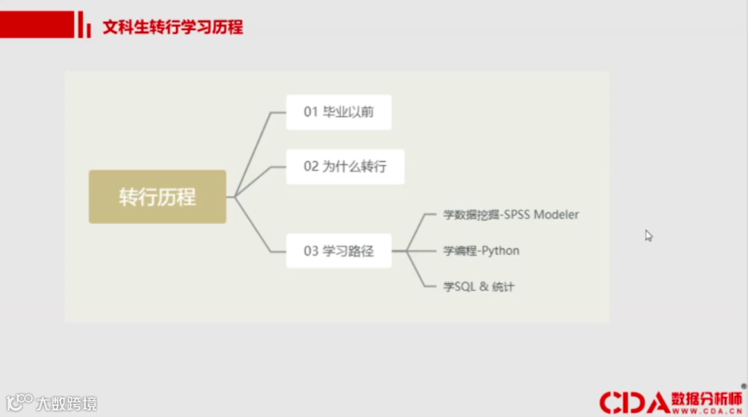 大家好,今天跟大家带来一个分享,主题是关于我如何从文科生转行为数据挖掘工程师的。