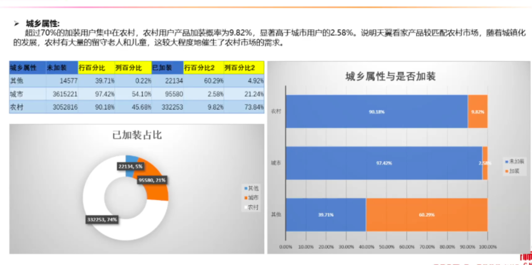 比如说农村用户家装的是33万,城市用户家装是9万多。这里看到百分比,农村占比70%,其实是远远超过城市的。在城市这个群体中,家装概率是2.58%,然后在农村这个群体中,它加装的概率是9.82%。可以看到,如果营销农村这个区域,响应概率来说相对会比较高。