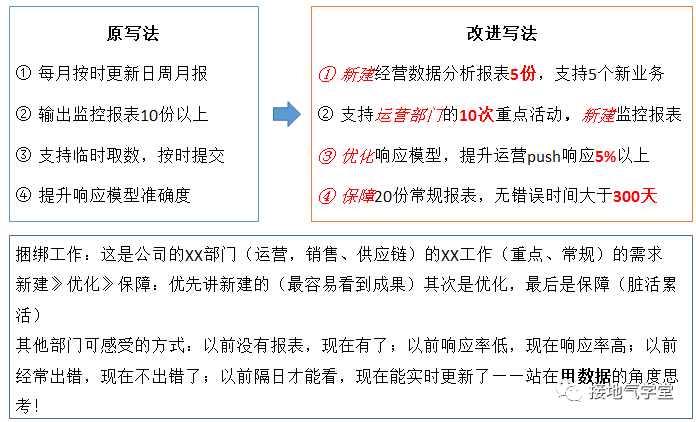 以上四个写法里,1、2、3是严重不及格的。因为1、2、3都是数据分析自己的事,即跟业绩、收入没有关系,虽然嘴上喊:数据驱动,数字化转型。可到底驱动了谁,驱动了多少,有驱没驱怎么衡量,一句都没讲清楚,业务部门认不认账也不知道,就是空谈。
