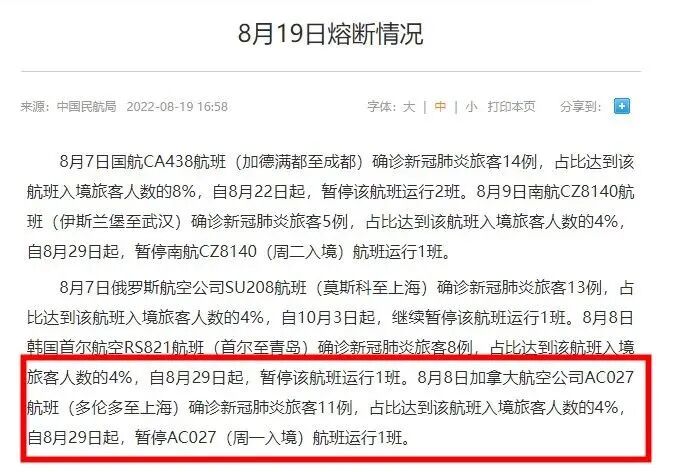 8月6日加航AC025(温哥华-上海)确诊新冠肺炎旅客6例,自8月22日起,暂停该航班(周六入境)运行2班。