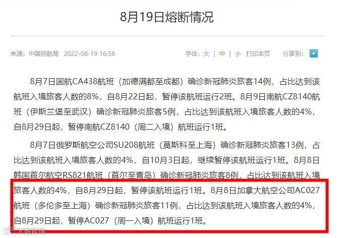 8月19日,中国民航局公布了“熔断优化”后首次熔断情况。其中,8月8日加航AC027(多伦多-上海)确诊新冠肺炎11例,占比达到该航班入境旅客人数的4%,自8月29日起,暂停AC027(周一入境)航班运行1班。(根据之前的熔断机制会停运2班)