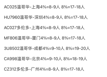 8月15日通报,8月4日四川航空3U8502航班(温哥华-成都)确诊新冠肺炎旅客5例,自8月22日起,暂停该航班运行2班。8月8日通报,7月30日海航HU7960航班(温哥华-深圳)确诊新冠肺炎旅客11例;自8月15日起,暂停该航班运行4班。如此一来,8月份共有11趟加拿大回国航班惨遭熔断,共涉及5条航线。