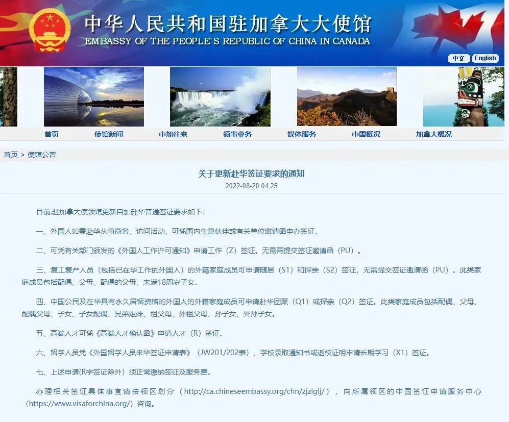 就在刚刚,中国驻加拿大大使馆发布了最新的《关于更新赴华签证要求的通知》。跟之前6月20日发布的赴华签证要求相比,又有所放宽。
