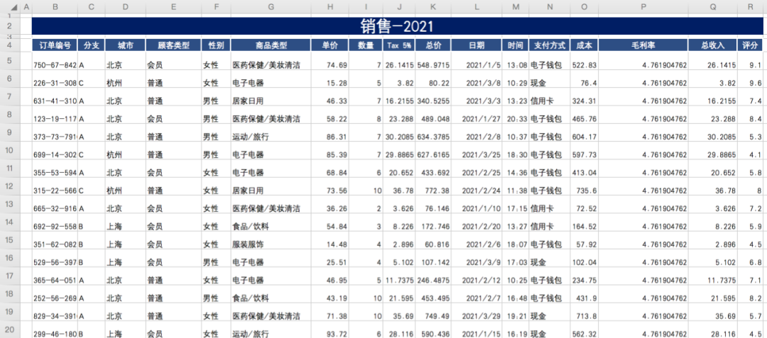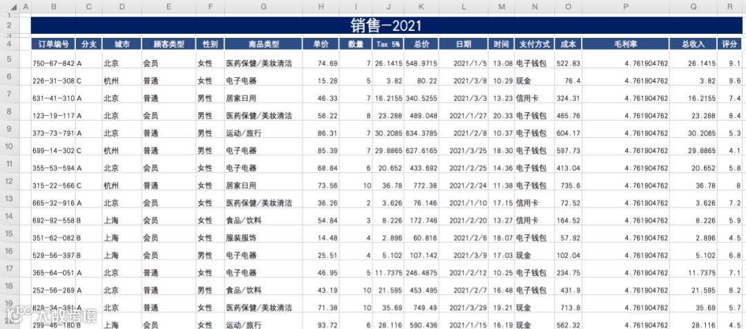 剩下还包含订单编号、商品类型、单价、数量、总价、日期、时间、支付方式、成本、毛利率、总收入、评分等信息。