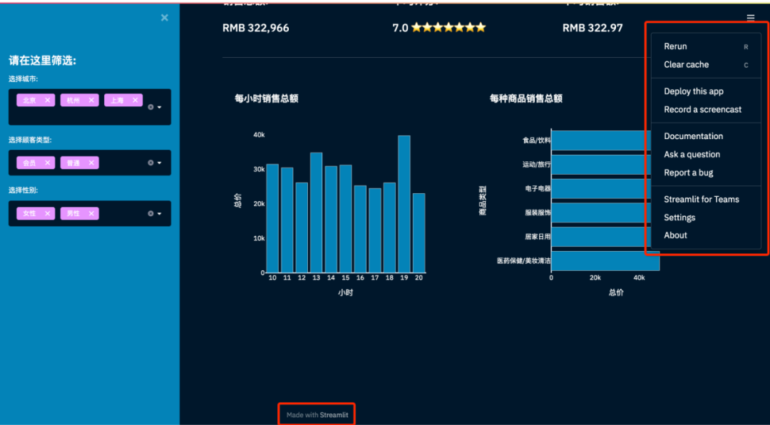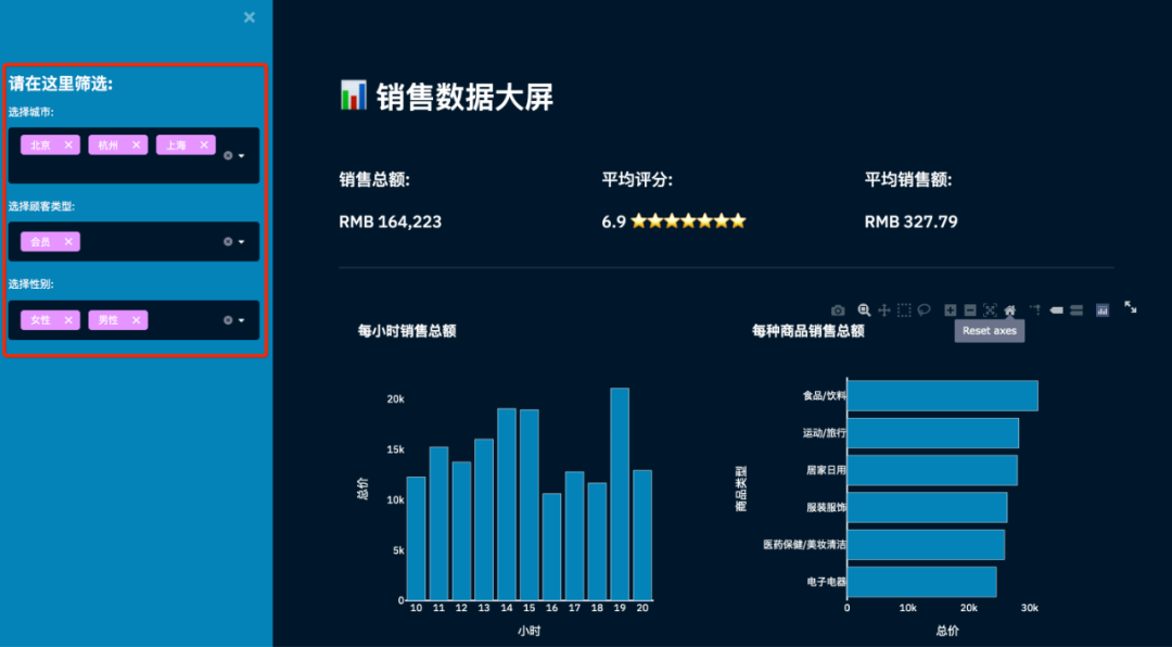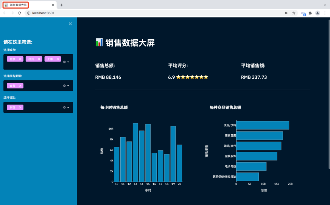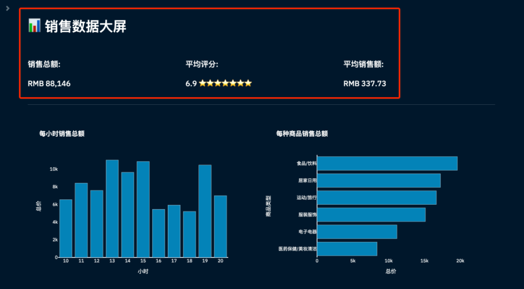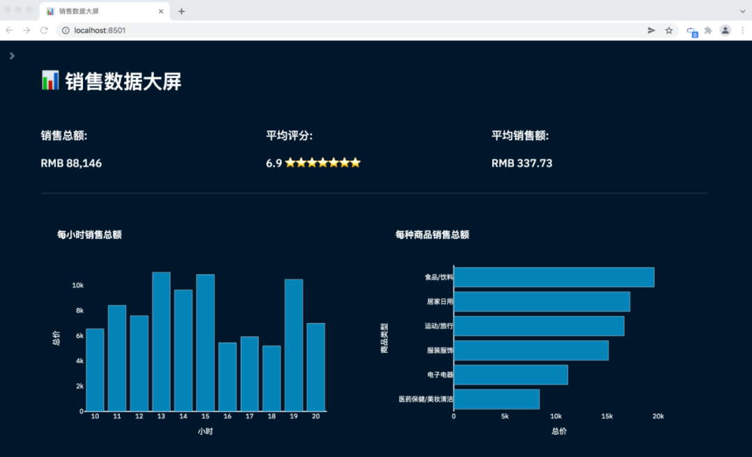 包含了两个图表,一个是每小时销售额,一个是各类商品销售总额。通过Plotly Express完成图表的绘制。