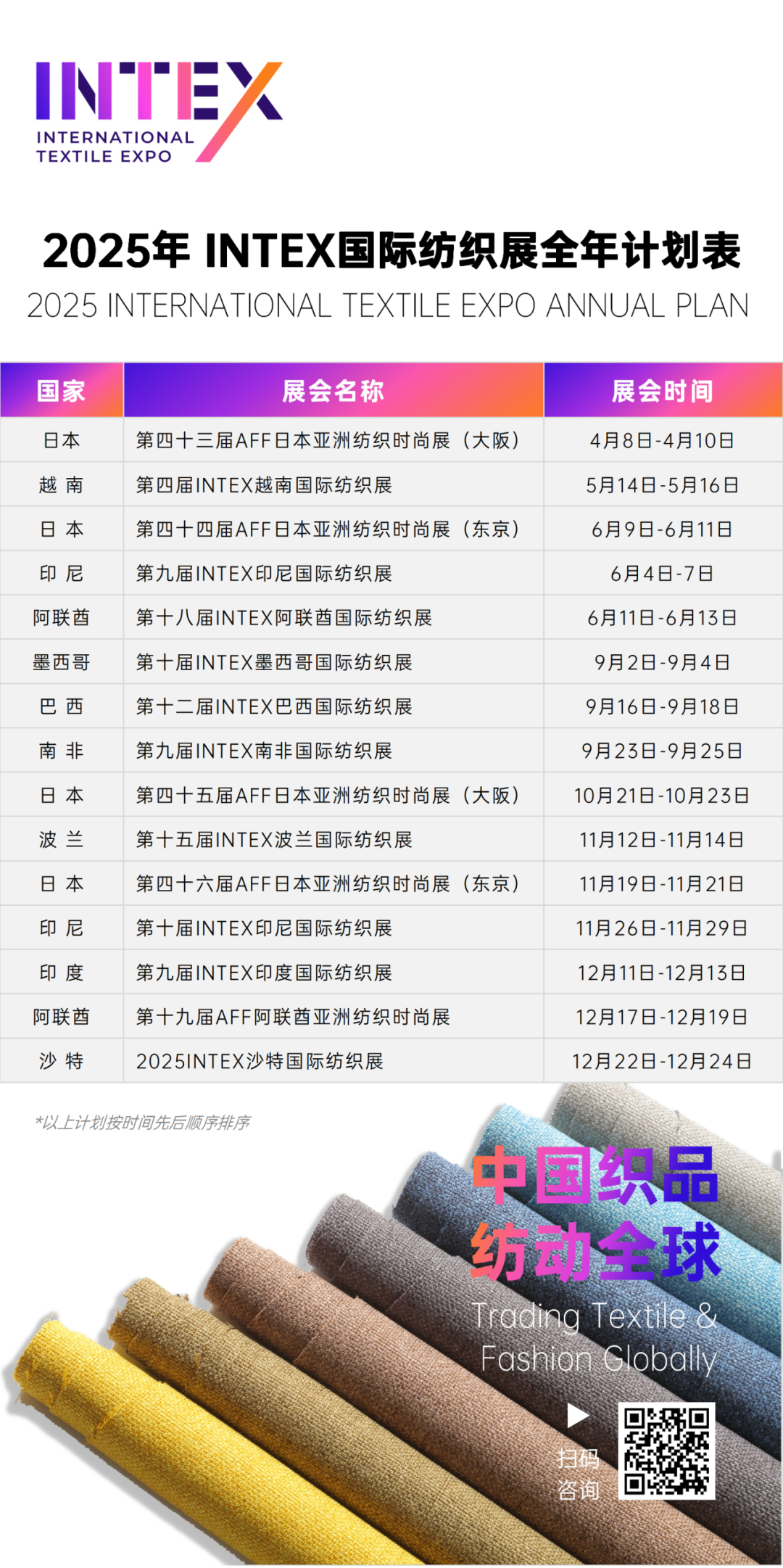 2025年,INTEX国际纺织展将在越南、印尼、阿联酋、日本、南非、波兰、墨西哥、巴西、印度、沙特阿拉伯等全球重点纺织地区举办15+场专业纺织服装展,展品范围涵盖原材料、纱线、面料、辅料、服装服饰、家纺及面料、箱包、鞋业、纺织机械、纺织设备等各细分领域,聚焦一带一路、RCEP、金砖国家经济带,发掘新兴市场商机!