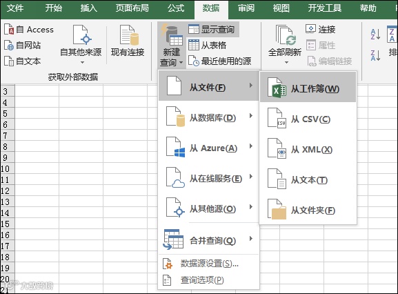 而到了Excel2016,微软直接把PQ的功能嵌入进来,放在数据选项卡下。