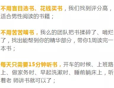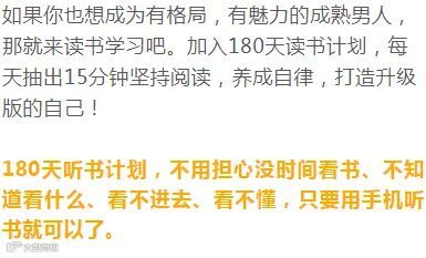 “谁说看书只能用整块时间,你可以试试听书啊,早上八点钟起床打开手机听书,吃早餐的时候和孩子一起听书,上下班的路上,刷微博逛淘宝、睡前刷朋友圈的时候,可以边听书边放松。”