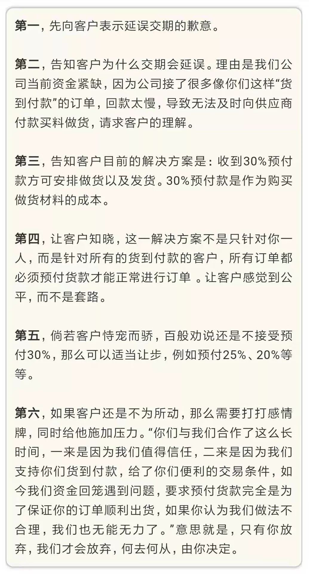 “因为我们公司接了太多像你们这样货到付款的订单,才导致资金周转不畅。现在公司决定先付预付款的先安排出货,为了您的订单尽早出货,还请抓紧时间安排预付款。”