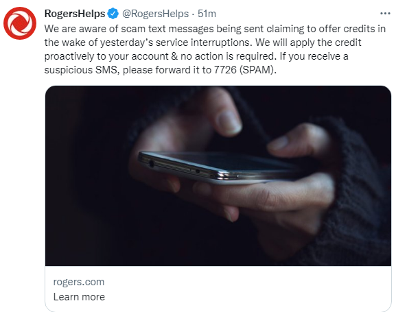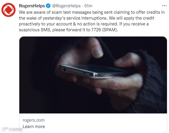 周六下午,Rogers公司还发布官方警告称:有人收到短信,是关于断网向客户提供补偿的信息,这是诈骗短信。Rogers公司会将抵免额(credit)自动发放到你的账户里,用户无需进行任何操作。