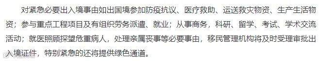 但是,对于那些有合理需求或者因紧急必要事由需要出境的,移民管理局将及时受理审批出入境证件,还会为情况特别紧急的人员提供“绿色通道”。