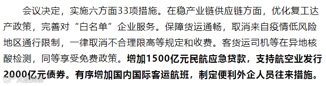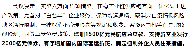 会议中提到,国家将增加1500亿元民航应急贷款,支持航空业发行2000亿元债券。有序增加国内国际客运航班,制定便利外企人员往来措施。