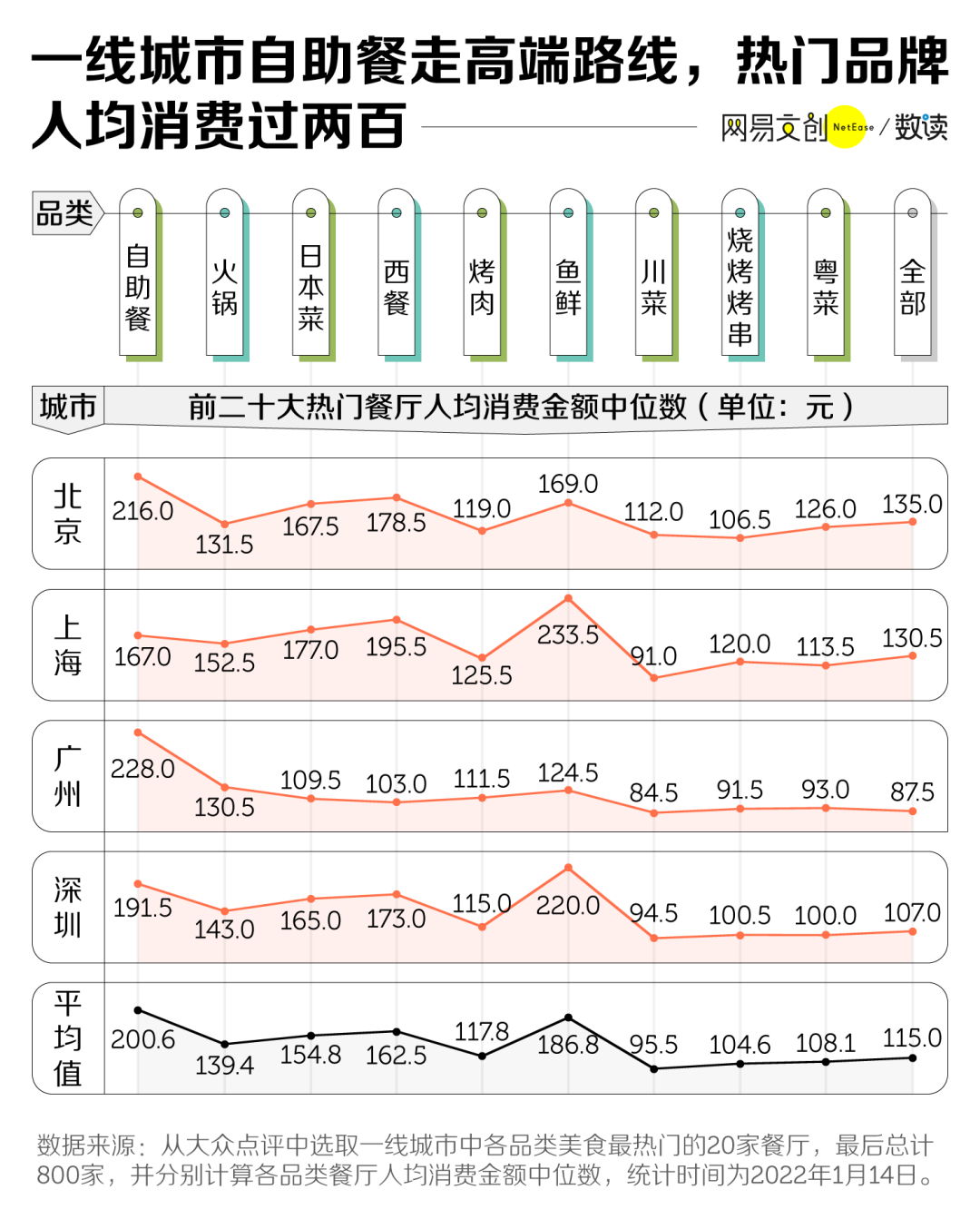 如今在一线城市里称霸的自助餐厅走的多是高端路线,打出各种畅吃和牛、鲍鱼等招牌。在大众点评中,一线城市热门榜上的高端自助餐厅,平均人均消费价格达到 200 元,超过了同处热门榜的火锅、日料等品类。