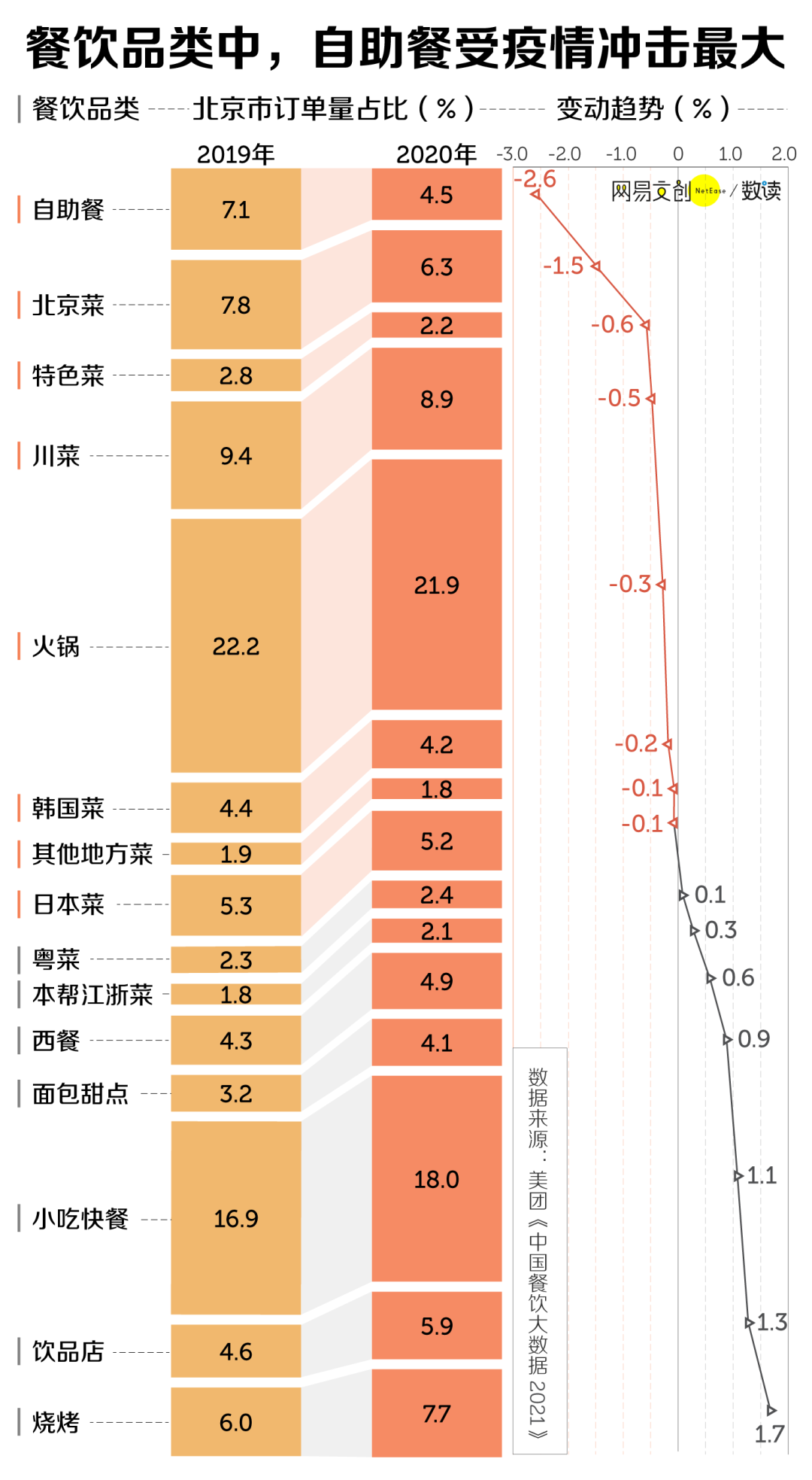 2019 年,北京市餐饮品类中自助餐订单量占比为 7.1%,在火锅、小吃快餐、川菜、北京菜之后。2020 年,自助餐这一占比只剩下 4.5%,市场份额被西餐、日料、饮品、烧烤等挤压 [3]。