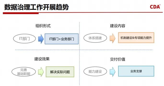 企业进行数据治理的过程中,顶层设计和组织建设尤其关键。我们需要将数据治理视作一项战略层面的活动,要有明确的目标和方向,使得数据治理最终能够满足业务需求,为业务创造价值。