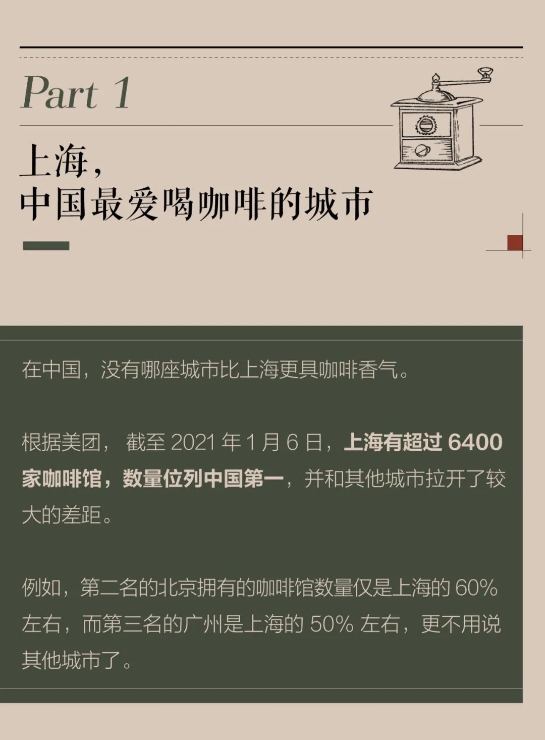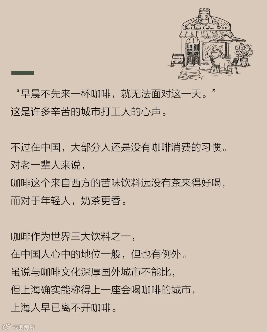 2、上海人喝咖啡的习惯可以追溯到上海开埠的 1843 年,外国人的涌入带来了咖啡,这也是上海咖啡文化浓厚的历史原因。