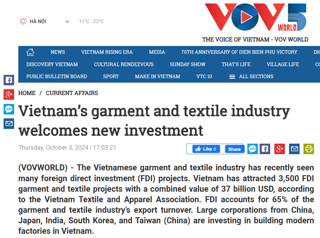 越南在服装生产技术和能力方面持续提升,吸引了许多国际品牌和零售商选择在当地生产,以满足高质量和及时交货的需求。越南的服装产业不断扩展,并吸引了大量外国直接投资。根据越南纺织和服装协会的数据,越南已吸引了3,500个外国直接投资项目,总投资额达到370亿美元,外资企业占服装和纺织业出口额的65%。外资在推动越南服装产业出口增长、创造就业、促进经济发展等方面发挥了关键作用。数据显示,在越南部分主要出口产品中,外资企业的出口额占比高达99%,如纺织品出口占比超过60%。