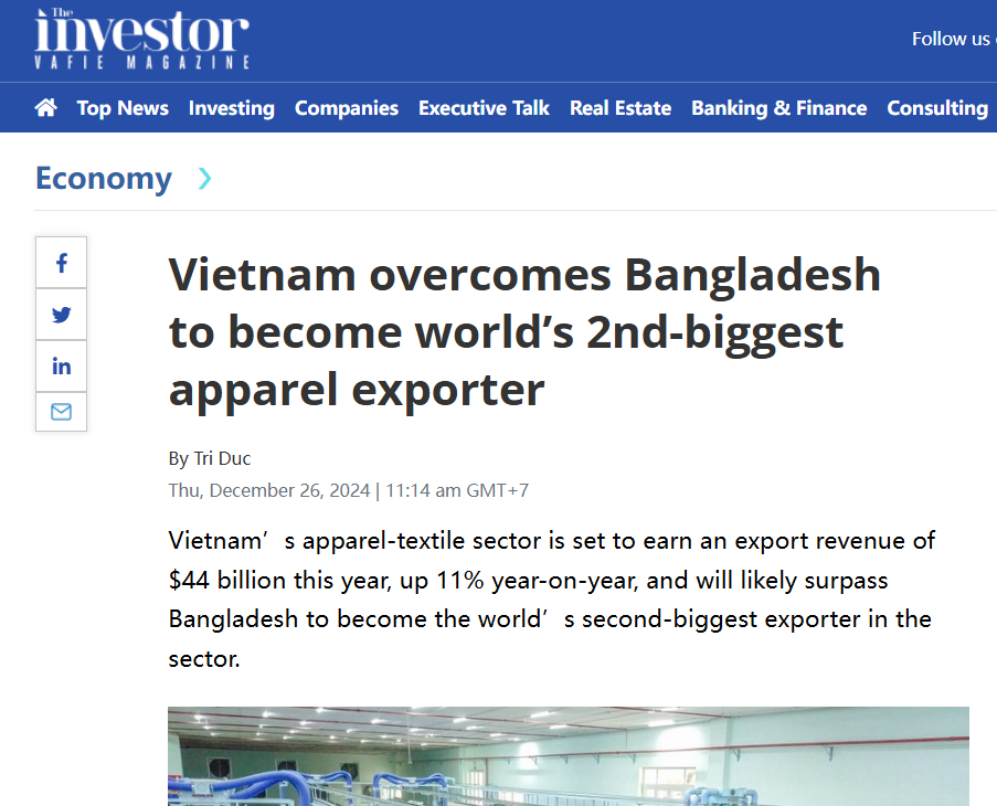 近期,外媒报道指出,越南有望取代孟加拉国,成为仅次于中国的全球第二大服装出口国。越南国家纺织服装集团Vinatex首席执行官Cao Huu Hieu在河内的新闻发布会上表示,越南预计2024年服装出口收入将达到440亿美元,同比增长11%,超出孟加拉国405亿美元目标近40亿美元。