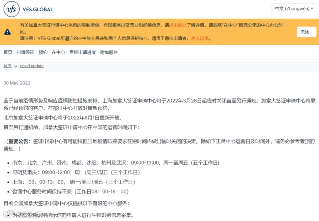 近日,VFS Global官宣北京加拿大签证中心已经在6月1日重新开放。