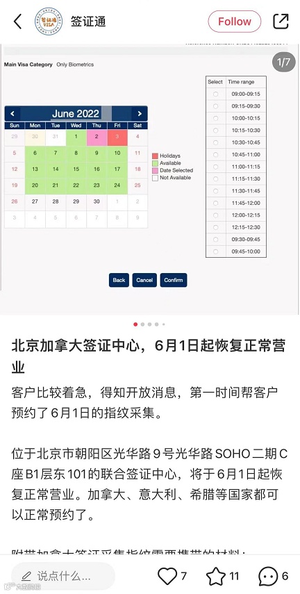 以上信息得到了网友证实。小红书博主@签证通发帖表示,位于北京市朝阳区光华路9号光华路SOHO二期C座B1层东101的联合签证中心,将于6月1日起恢复正常营业。加拿大、意大利、希腊等国家都可以正常预约了。