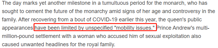 一些媒体指出,由于未详细说明病因导致的行动不便,英国女王公开行程已被从最大程度的缩短。