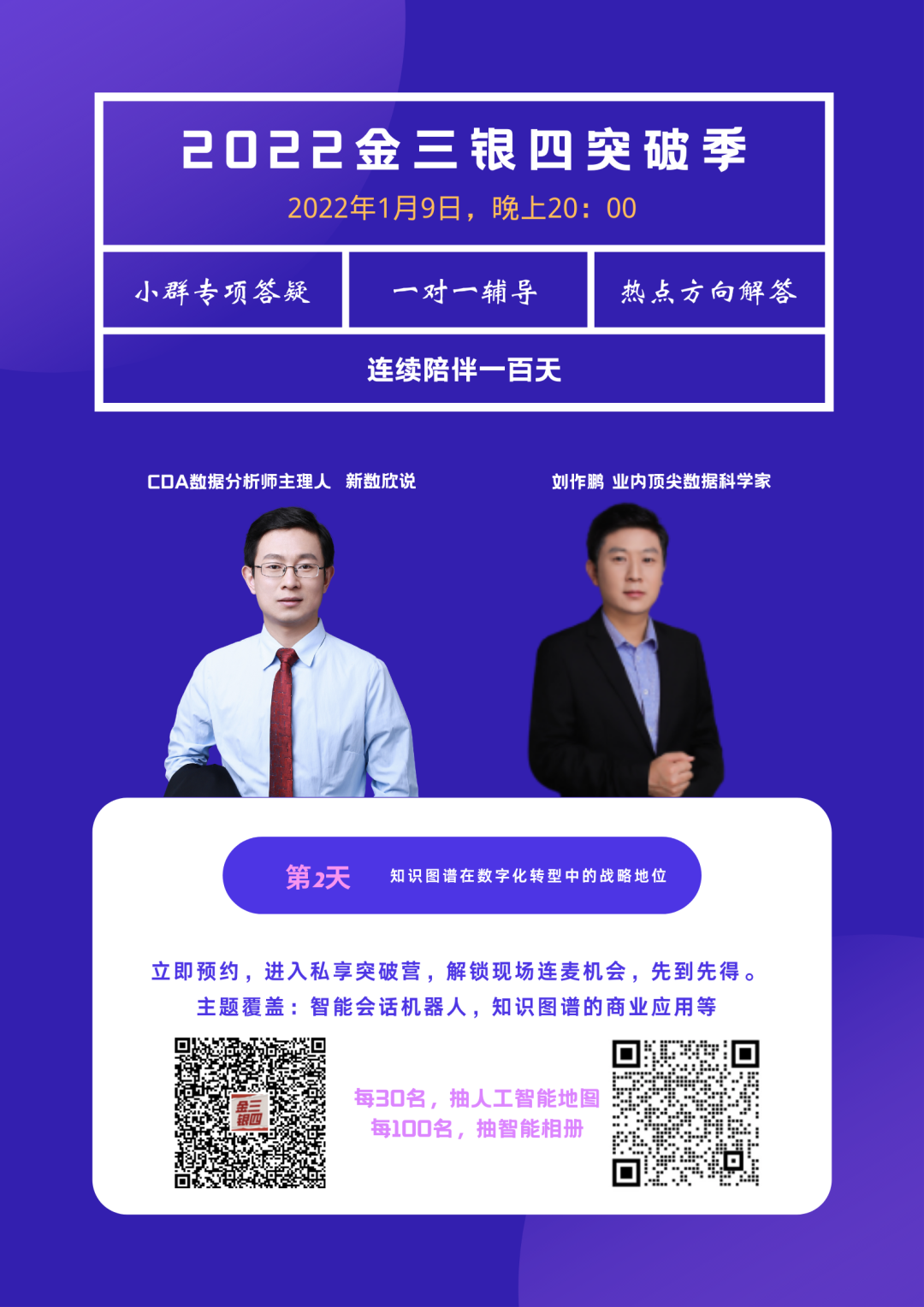 所以,我们经过两个月精心准备,邀请大健康、大金融、大智造、新金融、新经济等产业领域的技术专家、业务专家,论证了10大产业,100多个新方向主题,打造了CDA-2022金三银四突破季,我们期望在这100天的时间里,帮助您取得突破,在2022年绚丽绽放。