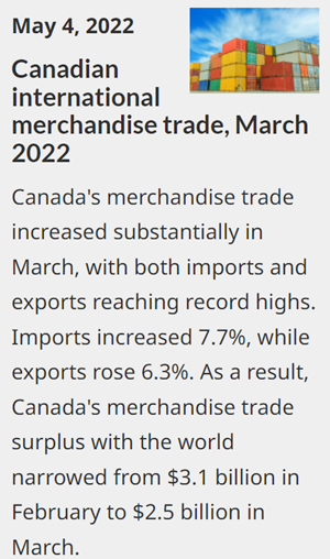 加拿大统计局表示加拿大3月份商品贸易大幅增长,进出口均创历史新高。进口增长 7.7%,出口增长 6.3%。结果,加拿大与世界的商品贸易顺差从 2 月的 31 亿加元收窄至 3 月的 25 亿加元。