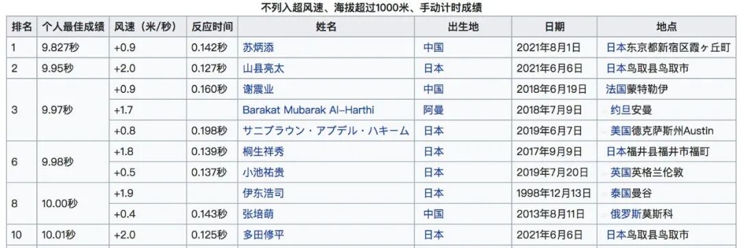 可以看到,在前十名中,除了苏炳添以9秒83位居第一,还有谢震业和张培萌,共三位中国运动员。其次还有6名日本运动员。