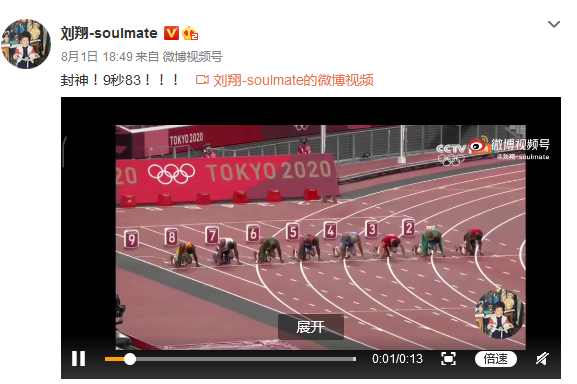 而刘翔也通过社交平台与苏炳添进行了 一次“梦幻”联动,刘翔配文:封神!9.83!!