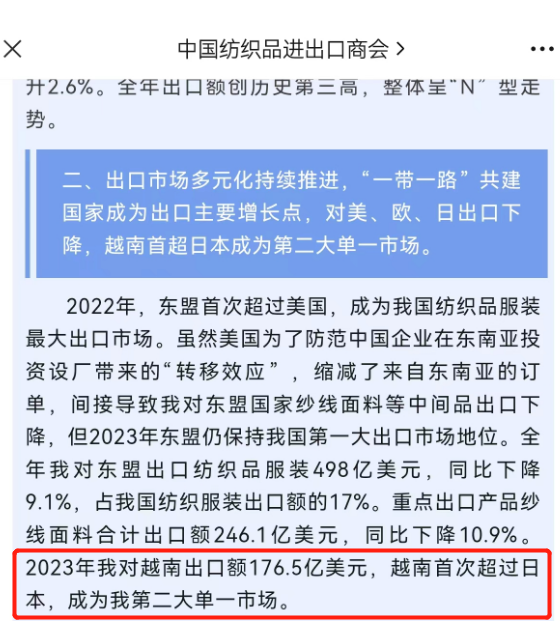 说到纺织服装产业的中间品贸易,越南则是纺织服装人绝对不可忽略的一个市场!随着欧美传统市场的疲软,”一带一路“共建国家成为出口主要增长点,越南则在2023年首次超越日本,成为我国出口的第二大单一市场,仅次于美国!